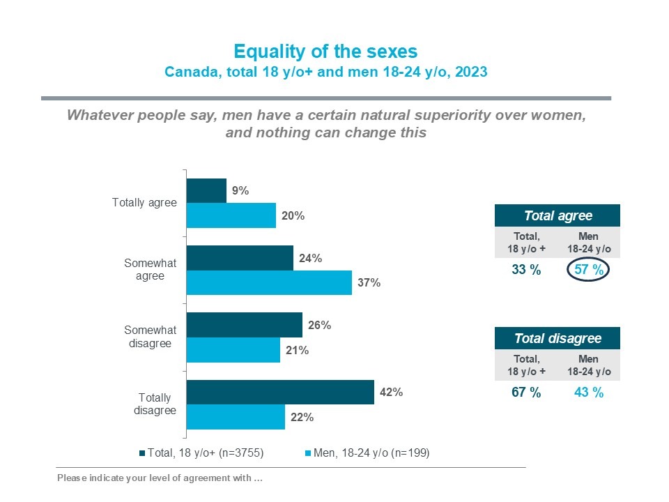 A clear expression of toxic masculinity is revealed through these results. Among some, an exceptionally high proportion aligns with the incel mindset in the country: one in three young men (34%) say they completely agree with the statement!