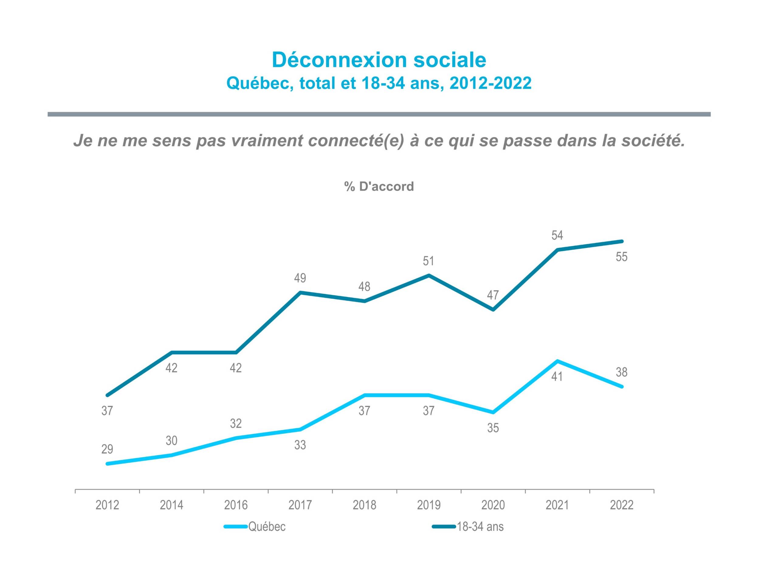 Cet indice chiffrait à près de trois Québécois sur dix en 2022 (29 %) la proportion de la population qui se sent marginalisée face aux gens autour d’elle ou dans la société en général (très ou extrêmement). Une croissance de 15 points depuis 2012 (moment où cet indice se chiffrait à 14 % - le nombre a doublé!) On y mesure aussi la croissance exceptionnelle du phénomène chez les jeunes générations (50 % chez les moins de 35 ans en 2022).